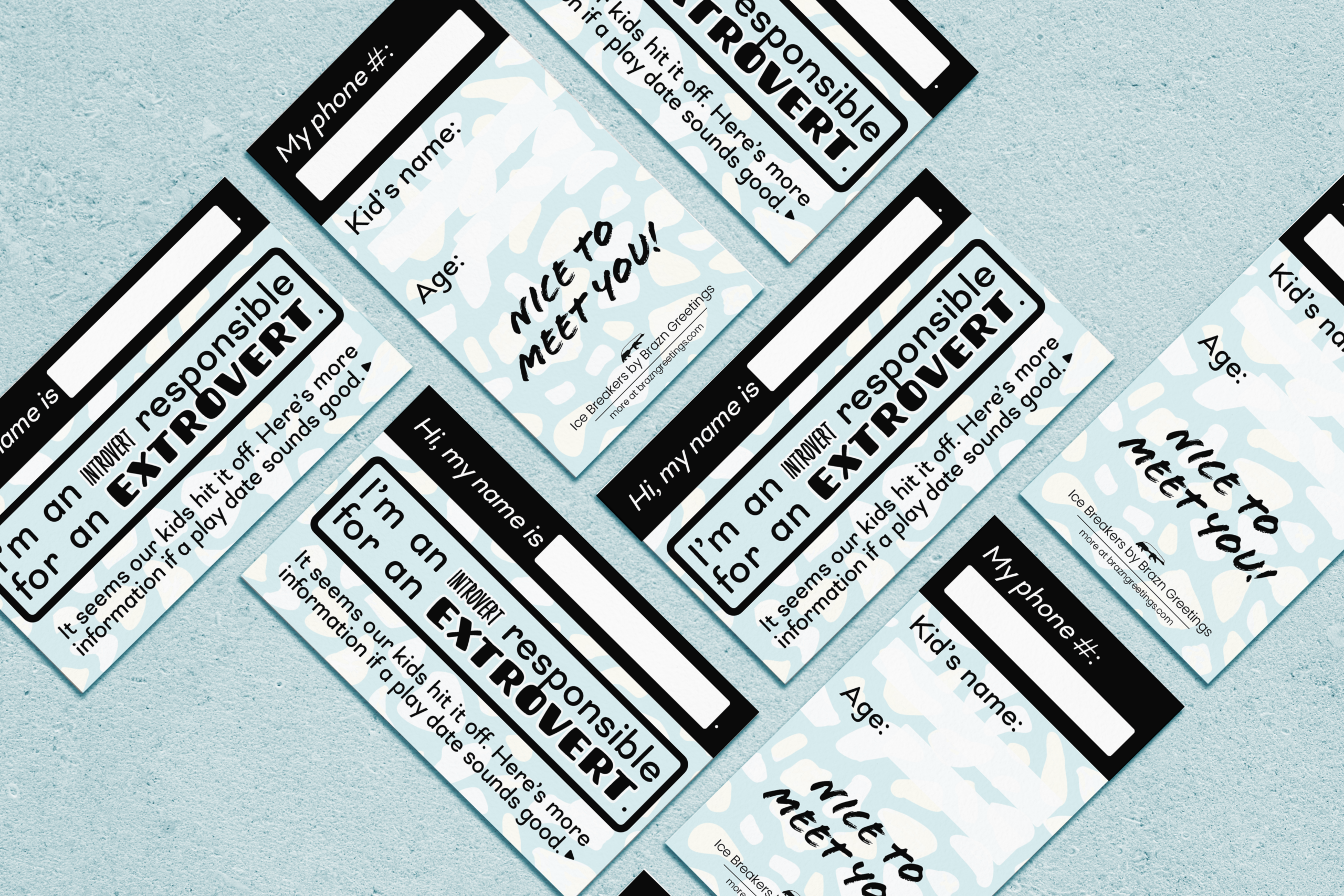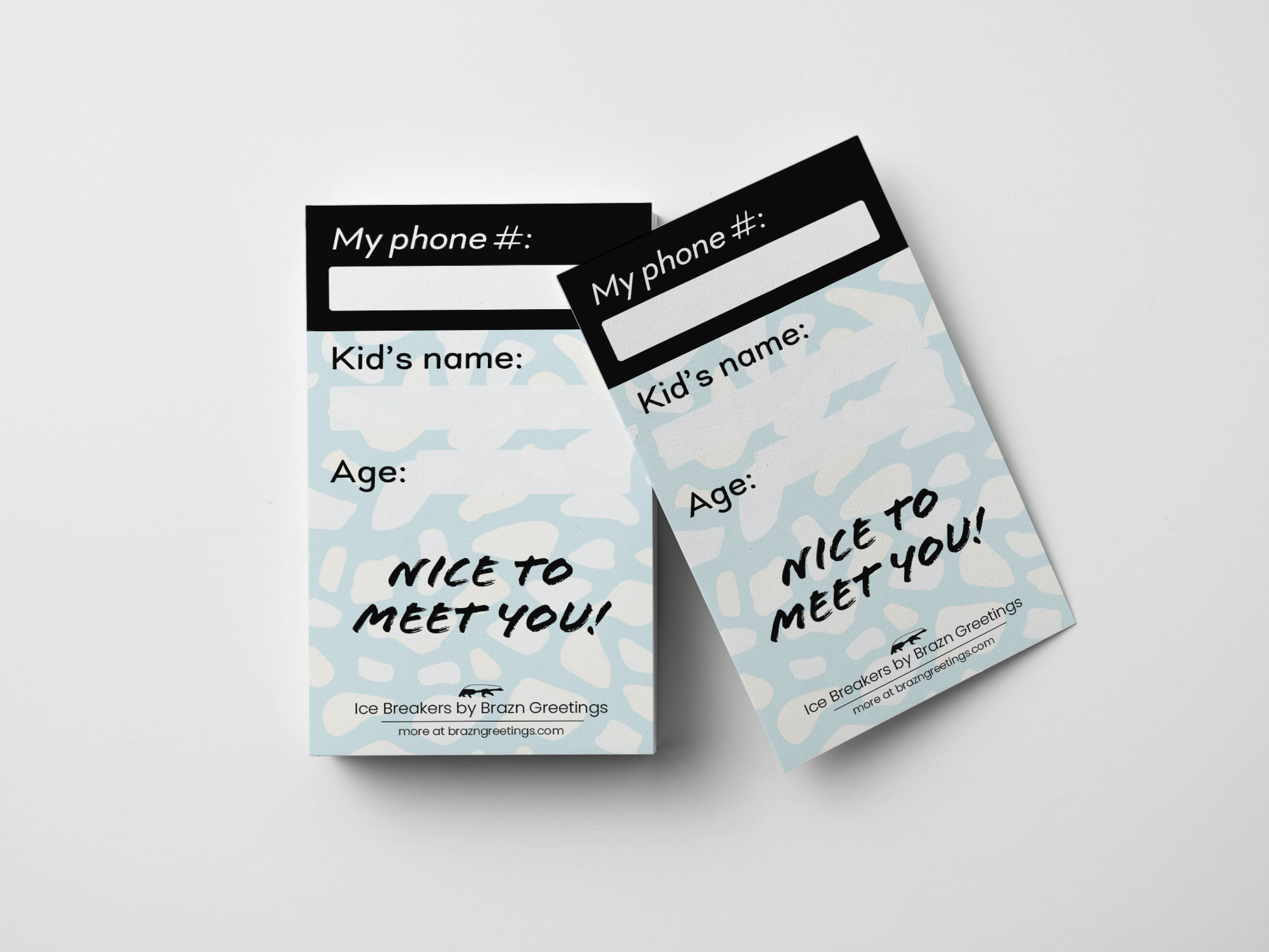 Side 2: Spaces to list your phone number, your kid’s name and age. “Nice to meet you!”